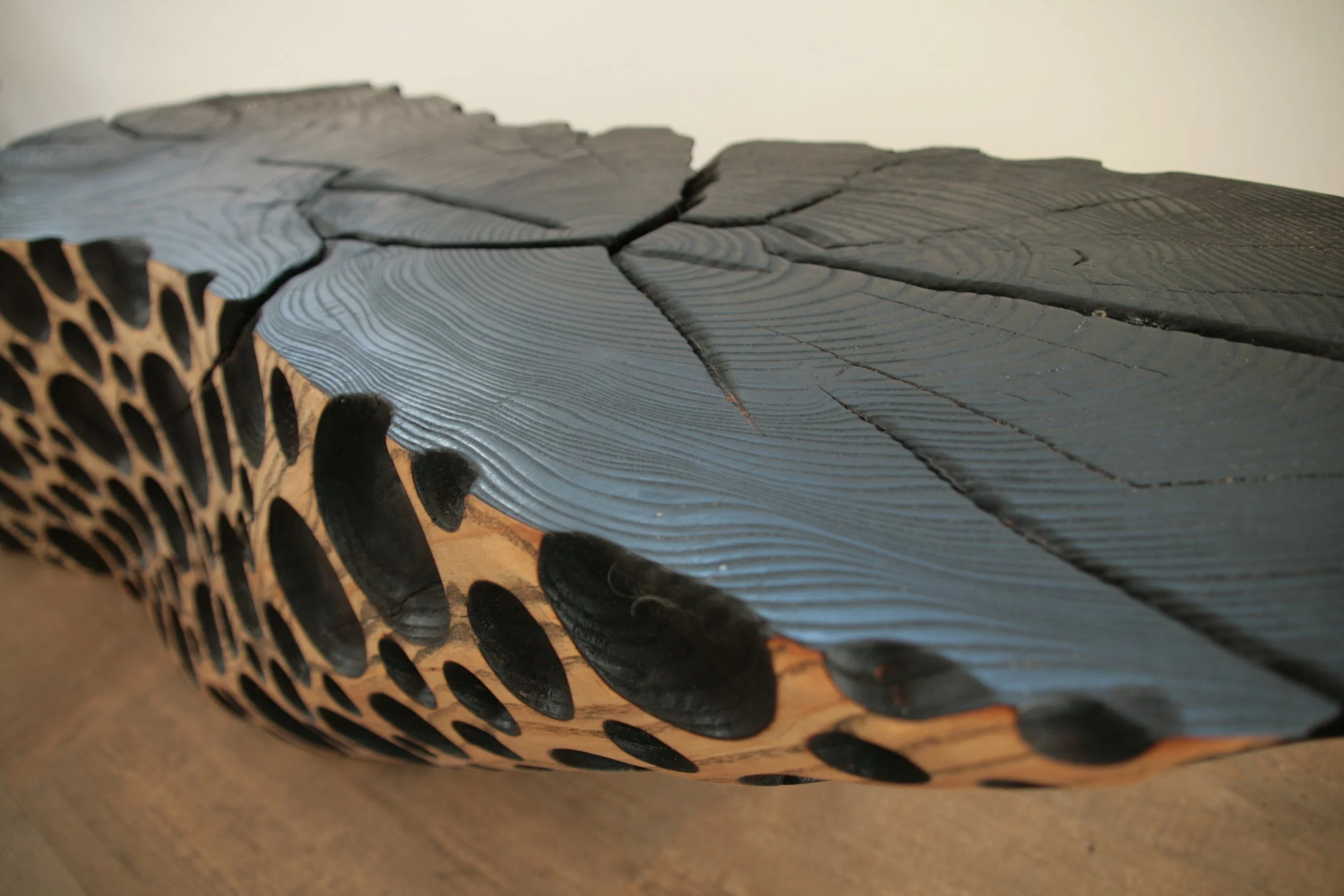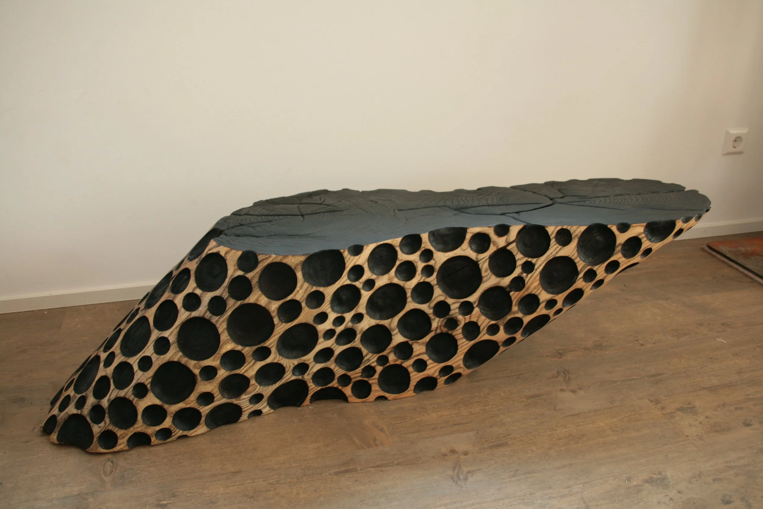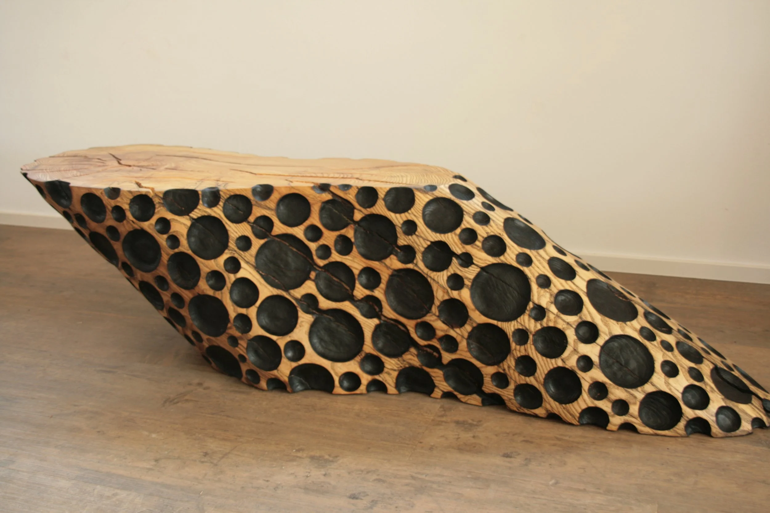 Esche, Bubbles und Oberfläche geflammt und geölt, kann auf beiden Seiten verwendet werden. Masse: LxBxH ca. 145x30x35cm