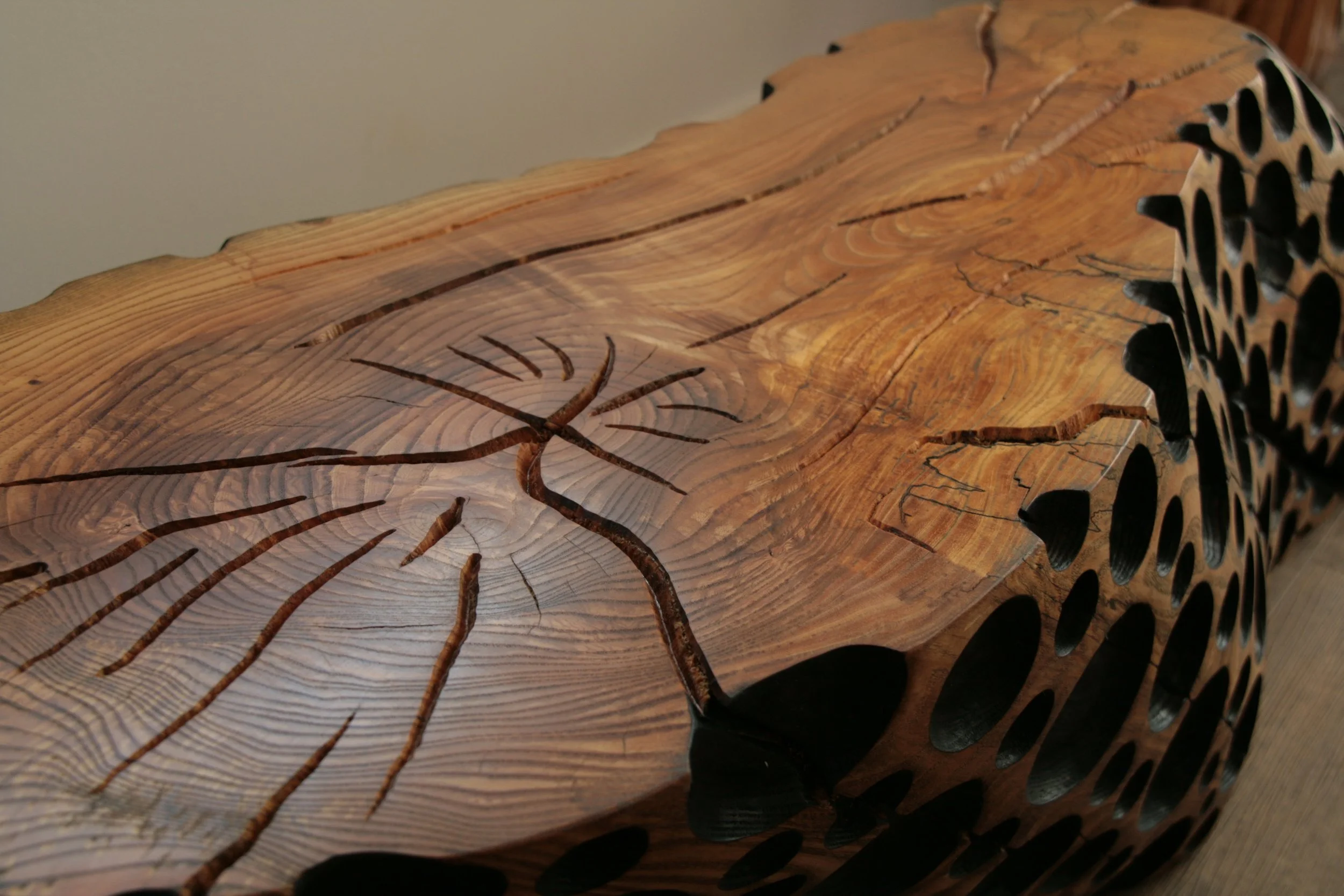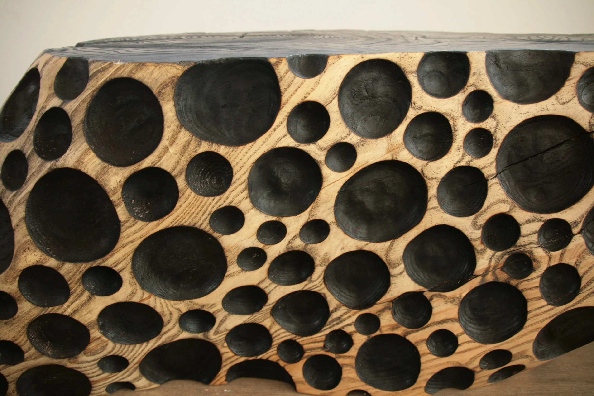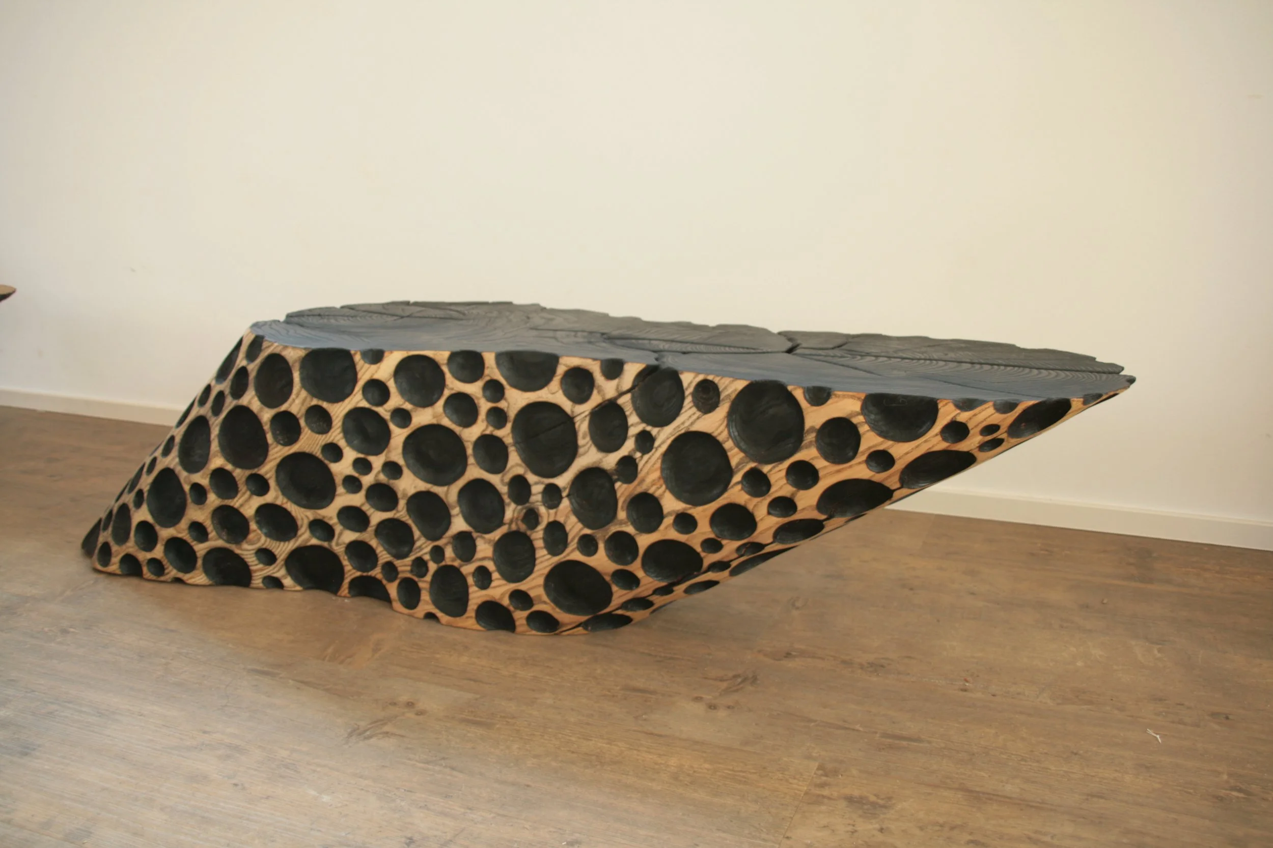 Esche, Bubbles und Oberfläche geflammt und geölt, kann auf beiden Seiten verwendet werden. Masse: LxBxH ca. 145x30x35cm