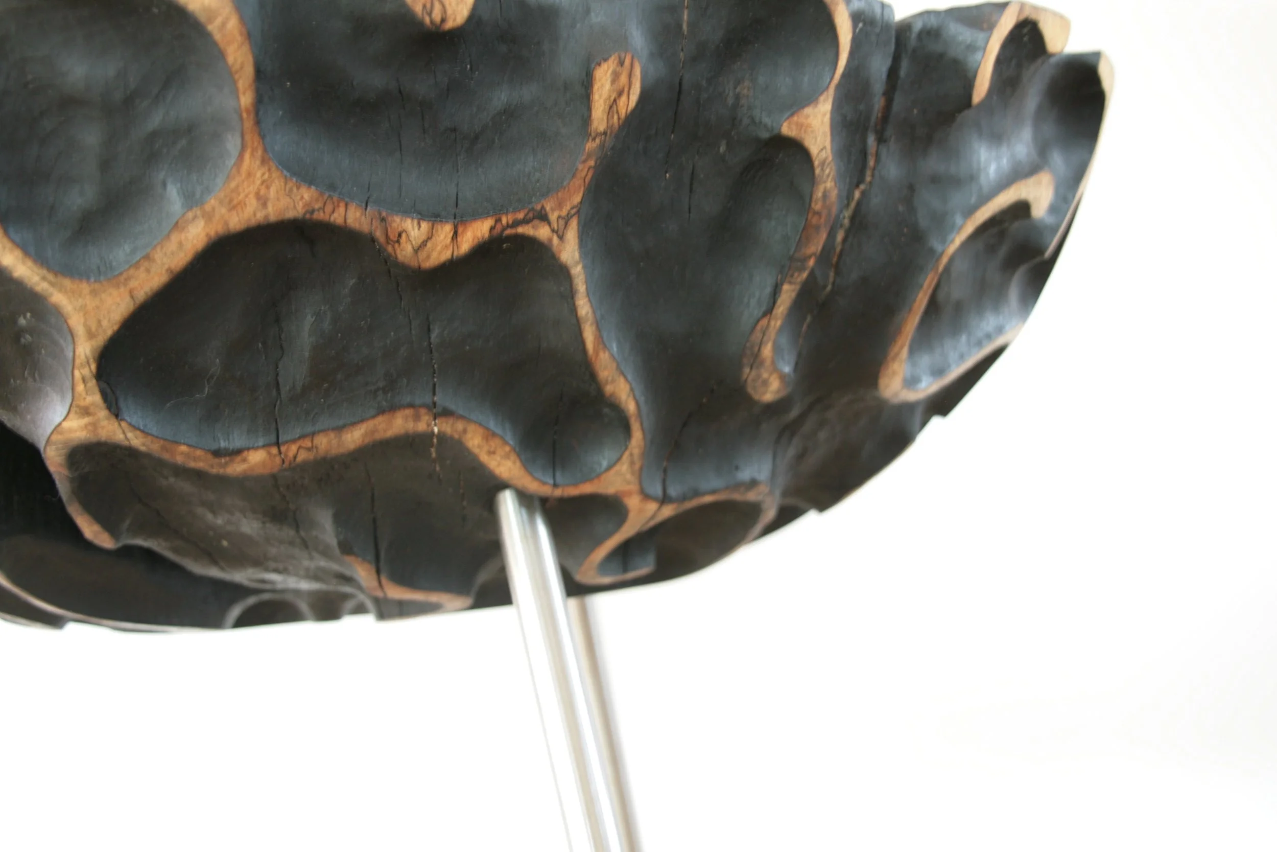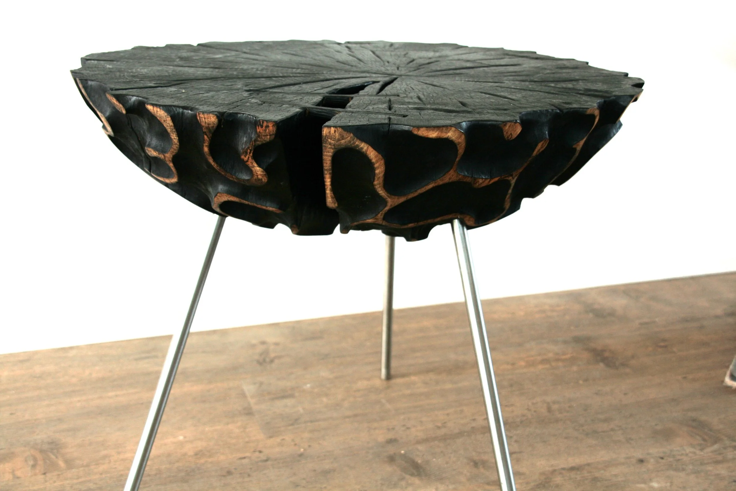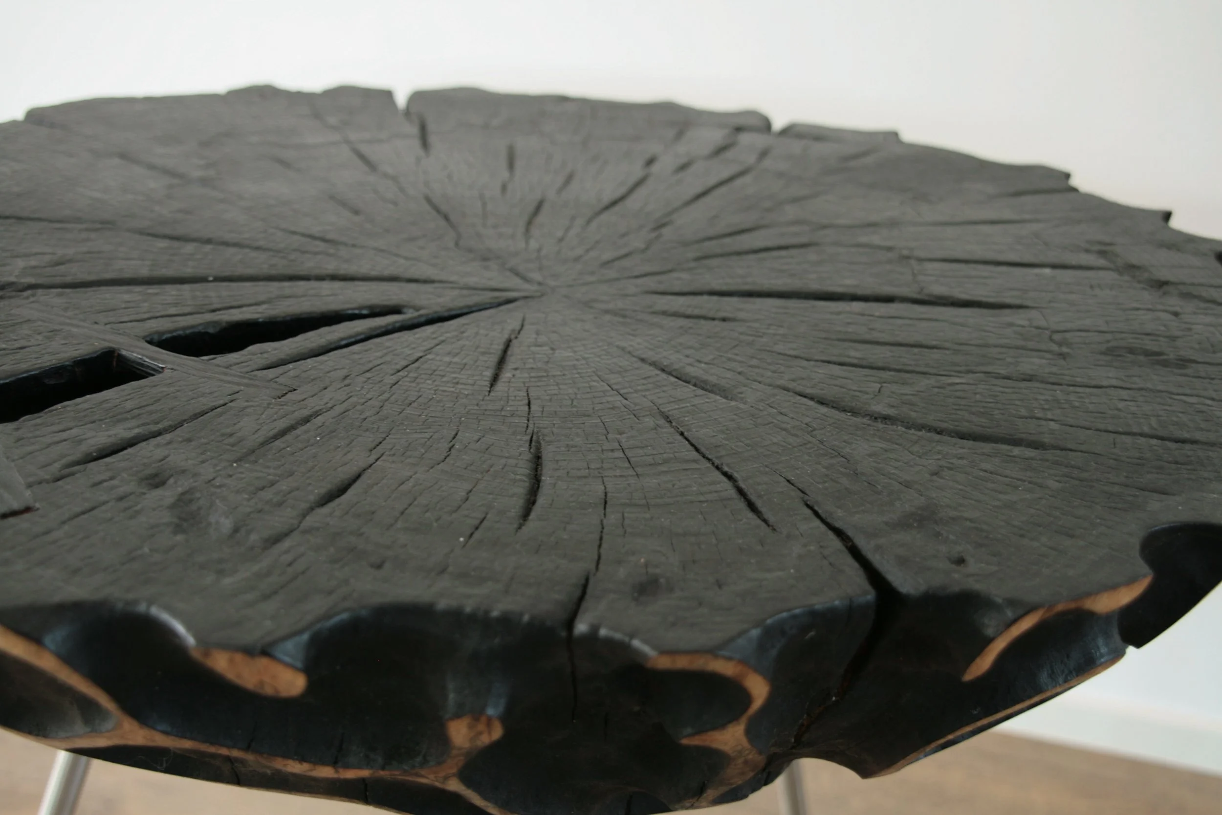 alte gestockte Eiche mit Intarsien, geflammt und geölt, auf Edelstahl.